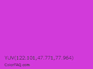 YUV 122.101,47.771,77.964 Color is a normal magenta color and the nearest color is Steel Pink #cc33cc. Hex code #d33adb and RGB value is rgb(211,58,219). In RGB color space, this color is composed of 83% red, 23% green, 86% blue, In CMYK color space, this color is composed of 4% cyan, 74% magenta, 0% yellow , 14% black , In HSL color space, this color has a hue angle of 297° , 69% saturation and 54% lightness.