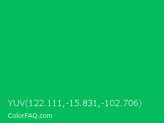 YUV 122.111,-15.831,-102.706 Color is a normal green color and the nearest color is GO Green #00ab66. Hex code #05bc5a and RGB value is rgb(5,188,90). In RGB color space, this color is composed of 2% red, 74% green, 35% blue, In CMYK color space, this color is composed of 97% cyan, 0% magenta, 52% yellow , 26% black , In HSL color space, this color has a hue angle of 148° , 95% saturation and 38% lightness.