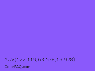 YUV 122.119,63.538,13.928 Color is a light indigo color and the nearest color is Navy Purple #9457eb. Hex code #8a59fb and RGB value is rgb(138,89,251). In RGB color space, this color is composed of 54% red, 35% green, 98% blue, In CMYK color space, this color is composed of 45% cyan, 65% magenta, 0% yellow , 2% black , In HSL color space, this color has a hue angle of 258° , 95% saturation and 67% lightness.