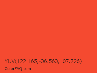 YUV 122.165,-36.563,107.726 Color is a normal red color and the nearest color is Flamingo #f2552a. Hex code #f54a30 and RGB value is rgb(245,74,48). In RGB color space, this color is composed of 96% red, 29% green, 19% blue, In CMYK color space, this color is composed of 0% cyan, 70% magenta, 80% yellow , 4% black , In HSL color space, this color has a hue angle of 8° , 91% saturation and 57% lightness.