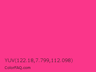 YUV 122.18,7.799,112.098 Color is a normal rose color and the nearest color is French Fuchsia #fd3f92. Hex code #fa368a and RGB value is rgb(250,54,138). In RGB color space, this color is composed of 98% red, 21% green, 54% blue, In CMYK color space, this color is composed of 0% cyan, 78% magenta, 45% yellow , 2% black , In HSL color space, this color has a hue angle of 334° , 95% saturation and 60% lightness.