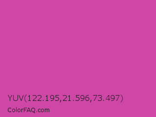 YUV 122.195,21.596,73.497 Color is a normal magenta color and the nearest color is Pink Pantone #d74894. Hex code #ce47a6 and RGB value is rgb(206,71,166). In RGB color space, this color is composed of 81% red, 28% green, 65% blue, In CMYK color space, this color is composed of 0% cyan, 66% magenta, 19% yellow , 19% black , In HSL color space, this color has a hue angle of 318° , 58% saturation and 54% lightness.