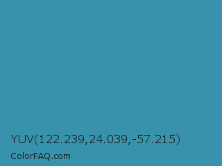 YUV 122.239,24.039,-57.215 Color is a normal cyan color and the nearest color is Boston Blue #3b91b4. Hex code #3992ab and RGB value is rgb(57,146,171). In RGB color space, this color is composed of 22% red, 57% green, 67% blue, In CMYK color space, this color is composed of 67% cyan, 15% magenta, 0% yellow , 33% black , In HSL color space, this color has a hue angle of 193° , 50% saturation and 45% lightness.