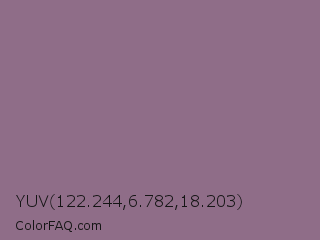 YUV 122.244,6.782,18.203 Color is a normal magenta color and the nearest color is Strikemaster #956387. Hex code #8f6d88 and RGB value is rgb(143,109,136). In RGB color space, this color is composed of 56% red, 43% green, 53% blue, In CMYK color space, this color is composed of 0% cyan, 24% magenta, 5% yellow , 44% black , In HSL color space, this color has a hue angle of 312° , 13% saturation and 49% lightness.