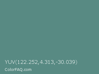 YUV 122.252,4.313,-30.039 Color is a normal cyan color and the nearest color is Wintergreen Dream #56887d. Hex code #588a83 and RGB value is rgb(88,138,131). In RGB color space, this color is composed of 35% red, 54% green, 51% blue, In CMYK color space, this color is composed of 36% cyan, 0% magenta, 5% yellow , 46% black , In HSL color space, this color has a hue angle of 172° , 22% saturation and 44% lightness.