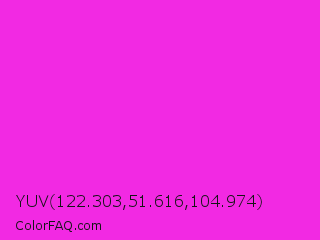 YUV 122.303,51.616,104.974 Color is a normal magenta color and the nearest color is Hot Magenta #ff1dce. Hex code #f229e3 and RGB value is rgb(242,41,227). In RGB color space, this color is composed of 95% red, 16% green, 89% blue, In CMYK color space, this color is composed of 0% cyan, 83% magenta, 6% yellow , 5% black , In HSL color space, this color has a hue angle of 304° , 89% saturation and 55% lightness.