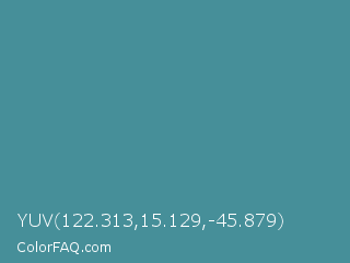 YUV 122.313,15.129,-45.879 Color is a normal cyan color and the nearest color is Wedgewood #4e7f9e. Hex code #468f99 and RGB value is rgb(70,143,153). In RGB color space, this color is composed of 27% red, 56% green, 60% blue, In CMYK color space, this color is composed of 54% cyan, 7% magenta, 0% yellow , 40% black , In HSL color space, this color has a hue angle of 187° , 37% saturation and 44% lightness.