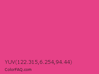 YUV 122.315,6.254,94.44 Color is a normal rose color and the nearest color is Cerise Pink #ec3b83. Hex code #e64187 and RGB value is rgb(230,65,135). In RGB color space, this color is composed of 90% red, 25% green, 53% blue, In CMYK color space, this color is composed of 0% cyan, 72% magenta, 41% yellow , 10% black , In HSL color space, this color has a hue angle of 335° , 77% saturation and 58% lightness.