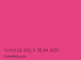 YUV 122.332,3.78,94.425 Color is a normal rose color and the nearest color is Cerise Pink #ec3b83. Hex code #e64282 and RGB value is rgb(230,66,130). In RGB color space, this color is composed of 90% red, 26% green, 51% blue, In CMYK color space, this color is composed of 0% cyan, 71% magenta, 43% yellow , 10% black , In HSL color space, this color has a hue angle of 337° , 77% saturation and 58% lightness.