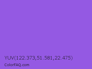 YUV 122.373,51.581,22.475 Color is a light violet color and the nearest color is Navy Purple #9457eb. Hex code #9459e3 and RGB value is rgb(148,89,227). In RGB color space, this color is composed of 58% red, 35% green, 89% blue, In CMYK color space, this color is composed of 35% cyan, 61% magenta, 0% yellow , 11% black , In HSL color space, this color has a hue angle of 266° , 71% saturation and 62% lightness.