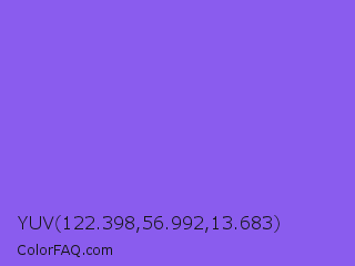 YUV 122.398,56.992,13.683 Color is a light indigo color and the nearest color is Navy Purple #9457eb. Hex code #8a5cee and RGB value is rgb(138,92,238). In RGB color space, this color is composed of 54% red, 36% green, 93% blue, In CMYK color space, this color is composed of 42% cyan, 61% magenta, 0% yellow , 7% black , In HSL color space, this color has a hue angle of 259° , 81% saturation and 65% lightness.