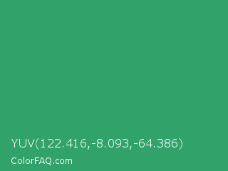 YUV 122.416,-8.093,-64.386 Color is a normal green color and the nearest color is Chateau Green #40a860. Hex code #31a36a and RGB value is rgb(49,163,106). In RGB color space, this color is composed of 19% red, 64% green, 42% blue, In CMYK color space, this color is composed of 70% cyan, 0% magenta, 35% yellow , 36% black , In HSL color space, this color has a hue angle of 150° , 54% saturation and 42% lightness.