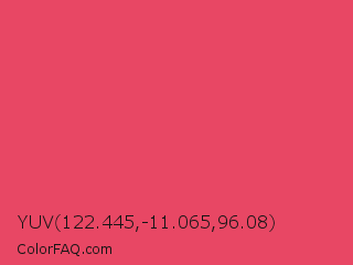 YUV 122.445,-11.065,96.08 Color is a normal red color and the nearest color is Paradise Pink #e63e62. Hex code #e84764 and RGB value is rgb(232,71,100). In RGB color space, this color is composed of 91% red, 28% green, 39% blue, In CMYK color space, this color is composed of 0% cyan, 69% magenta, 57% yellow , 9% black , In HSL color space, this color has a hue angle of 349° , 78% saturation and 59% lightness.