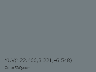 YUV 122.466,3.221,-6.548 Color is a normal blue color and the nearest color is Rolling Stone #747d83. Hex code #737d81 and RGB value is rgb(115,125,129). In RGB color space, this color is composed of 45% red, 49% green, 51% blue, In CMYK color space, this color is composed of 11% cyan, 3% magenta, 0% yellow , 49% black , In HSL color space, this color has a hue angle of 197° , 6% saturation and 48% lightness.