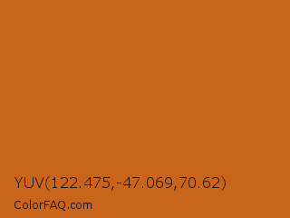 YUV 122.475,-47.069,70.62 Color is a normal orange color and the nearest color is Piper #c96323. Hex code #cb641b and RGB value is rgb(203,100,27). In RGB color space, this color is composed of 80% red, 39% green, 11% blue, In CMYK color space, this color is composed of 0% cyan, 51% magenta, 87% yellow , 20% black , In HSL color space, this color has a hue angle of 25° , 77% saturation and 45% lightness.