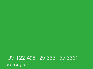 YUV 122.498,-29.333,-65.335 Color is a normal green color and the nearest color is Wageningen Green #34b233. Hex code #30ac3f and RGB value is rgb(48,172,63). In RGB color space, this color is composed of 19% red, 67% green, 25% blue, In CMYK color space, this color is composed of 72% cyan, 0% magenta, 63% yellow , 33% black , In HSL color space, this color has a hue angle of 127° , 56% saturation and 43% lightness.