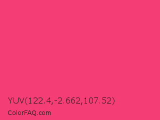 YUV 122.4,-2.662,107.52 Color is a normal rose color and the nearest color is Cerise Pink #ec3b83. Hex code #f53d75 and RGB value is rgb(245,61,117). In RGB color space, this color is composed of 96% red, 24% green, 46% blue, In CMYK color space, this color is composed of 0% cyan, 75% magenta, 52% yellow , 4% black , In HSL color space, this color has a hue angle of 342° , 90% saturation and 60% lightness.