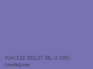 YUV 122.503,27.36,-2.195 Color is a normal indigo color and the nearest color is Toolbox #746cc0. Hex code #7871b2 and RGB value is rgb(120,113,178). In RGB color space, this color is composed of 47% red, 44% green, 70% blue, In CMYK color space, this color is composed of 33% cyan, 37% magenta, 0% yellow , 30% black , In HSL color space, this color has a hue angle of 246° , 30% saturation and 57% lightness.