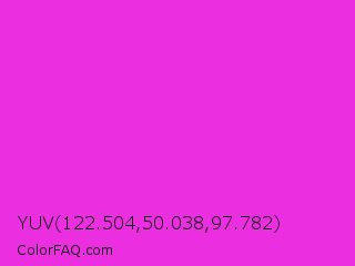 YUV 122.504,50.038,97.782 Color is a normal magenta color and the nearest color is Razzle Dazzle Rose #ff33cc. Hex code #ea2ee0 and RGB value is rgb(234,46,224). In RGB color space, this color is composed of 92% red, 18% green, 88% blue, In CMYK color space, this color is composed of 0% cyan, 80% magenta, 4% yellow , 8% black , In HSL color space, this color has a hue angle of 303° , 82% saturation and 55% lightness.