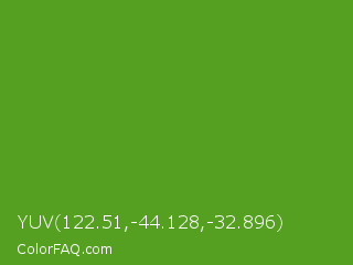 YUV 122.51,-44.128,-32.896 Color is a normal green color and the nearest color is Vida Loca #549019. Hex code #559f21 and RGB value is rgb(85,159,33). In RGB color space, this color is composed of 33% red, 62% green, 13% blue, In CMYK color space, this color is composed of 47% cyan, 0% magenta, 79% yellow , 38% black , In HSL color space, this color has a hue angle of 95° , 66% saturation and 38% lightness.