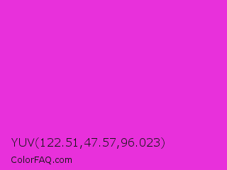 YUV 122.51,47.57,96.023 Color is a normal magenta color and the nearest color is Razzle Dazzle Rose #ff33cc. Hex code #e830db and RGB value is rgb(232,48,219). In RGB color space, this color is composed of 91% red, 19% green, 86% blue, In CMYK color space, this color is composed of 0% cyan, 79% magenta, 6% yellow , 9% black , In HSL color space, this color has a hue angle of 304° , 80% saturation and 55% lightness.