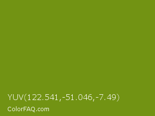YUV 122.541,-51.046,-7.49 Color is a normal lime color and the nearest color is Trendy Green #7c881a. Hex code #729313 and RGB value is rgb(114,147,19). In RGB color space, this color is composed of 45% red, 58% green, 7% blue, In CMYK color space, this color is composed of 22% cyan, 0% magenta, 87% yellow , 42% black , In HSL color space, this color has a hue angle of 75° , 77% saturation and 33% lightness.