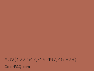 YUV 122.547,-19.497,46.878 Color is a normal red color and the nearest color is Santa Fe #b16d52. Hex code #b06753 and RGB value is rgb(176,103,83). In RGB color space, this color is composed of 69% red, 40% green, 33% blue, In CMYK color space, this color is composed of 0% cyan, 41% magenta, 53% yellow , 31% black , In HSL color space, this color has a hue angle of 13° , 37% saturation and 51% lightness.