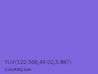 YUV 122.568,49.02,3.887 Color is a light indigo color and the nearest color is Medium Slate Blue #7b68ee. Hex code #7f65de and RGB value is rgb(127,101,222). In RGB color space, this color is composed of 50% red, 40% green, 87% blue, In CMYK color space, this color is composed of 43% cyan, 55% magenta, 0% yellow , 13% black , In HSL color space, this color has a hue angle of 253° , 65% saturation and 63% lightness.
