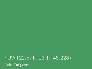 YUV 122.571,-13.1,-45.228 Color is a normal green color and the nearest color is Fruit Salad #4f9d5d. Hex code #479a60 and RGB value is rgb(71,154,96). In RGB color space, this color is composed of 28% red, 60% green, 38% blue, In CMYK color space, this color is composed of 54% cyan, 0% magenta, 38% yellow , 40% black , In HSL color space, this color has a hue angle of 138° , 37% saturation and 44% lightness.