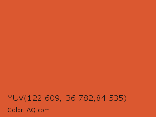 YUV 122.609,-36.782,84.535 Color is a normal red color and the nearest color is Flame Pea #da5b38. Hex code #db5830 and RGB value is rgb(219,88,48). In RGB color space, this color is composed of 86% red, 35% green, 19% blue, In CMYK color space, this color is composed of 0% cyan, 60% magenta, 78% yellow , 14% black , In HSL color space, this color has a hue angle of 14° , 70% saturation and 52% lightness.