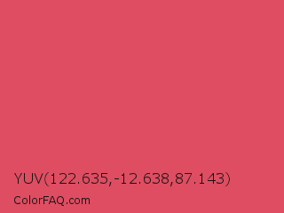 YUV 122.635,-12.638,87.143 Color is a normal red color and the nearest color is Mandy #e25465. Hex code #de4d61 and RGB value is rgb(222,77,97). In RGB color space, this color is composed of 87% red, 30% green, 38% blue, In CMYK color space, this color is composed of 0% cyan, 65% magenta, 56% yellow , 13% black , In HSL color space, this color has a hue angle of 352° , 69% saturation and 59% lightness.