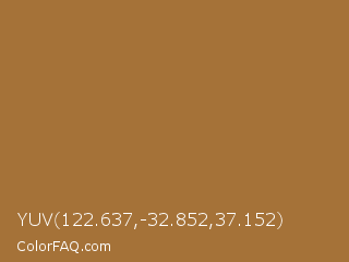 YUV 122.637,-32.852,37.152 Color is a normal orange color and the nearest color is Metallic Sunburst #9c7c38. Hex code #a57238 and RGB value is rgb(165,114,56). In RGB color space, this color is composed of 65% red, 45% green, 22% blue, In CMYK color space, this color is composed of 0% cyan, 31% magenta, 66% yellow , 35% black , In HSL color space, this color has a hue angle of 32° , 49% saturation and 43% lightness.
