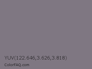 YUV 122.646,3.626,3.818 Color is a normal purple color and the nearest color is Jumbo #7c7b82. Hex code #7f7782 and RGB value is rgb(127,119,130). In RGB color space, this color is composed of 50% red, 47% green, 51% blue, In CMYK color space, this color is composed of 2% cyan, 8% magenta, 0% yellow , 49% black , In HSL color space, this color has a hue angle of 284° , 4% saturation and 49% lightness.