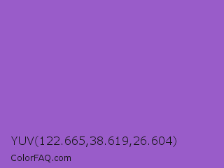 YUV 122.665,38.619,26.604 Color is a normal purple color and the nearest color is Amethyst #9966cc. Hex code #995cc9 and RGB value is rgb(153,92,201). In RGB color space, this color is composed of 60% red, 36% green, 79% blue, In CMYK color space, this color is composed of 24% cyan, 54% magenta, 0% yellow , 21% black , In HSL color space, this color has a hue angle of 274° , 50% saturation and 57% lightness.