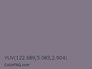 YUV 122.689,5.083,2.904 Color is a normal violet color and the nearest color is Mobster #7f7589. Hex code #7e7785 and RGB value is rgb(126,119,133). In RGB color space, this color is composed of 49% red, 47% green, 52% blue, In CMYK color space, this color is composed of 5% cyan, 11% magenta, 0% yellow , 48% black , In HSL color space, this color has a hue angle of 270° , 6% saturation and 49% lightness.