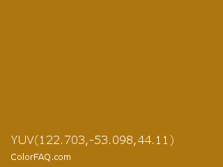 YUV 122.703,-53.098,44.11 Color is a normal orange color and the nearest color is Mandalay #ad781b. Hex code #ad760f and RGB value is rgb(173,118,15). In RGB color space, this color is composed of 68% red, 46% green, 6% blue, In CMYK color space, this color is composed of 0% cyan, 32% magenta, 91% yellow , 32% black , In HSL color space, this color has a hue angle of 39° , 84% saturation and 37% lightness.