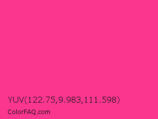 YUV 122.75,9.983,111.598 Color is a normal rose color and the nearest color is French Fuchsia #fd3f92. Hex code #fa368f and RGB value is rgb(250,54,143). In RGB color space, this color is composed of 98% red, 21% green, 56% blue, In CMYK color space, this color is composed of 0% cyan, 78% magenta, 43% yellow , 2% black , In HSL color space, this color has a hue angle of 333° , 95% saturation and 60% lightness.