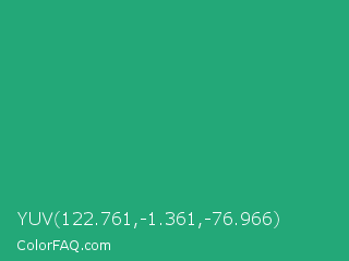YUV 122.761,-1.361,-76.966 Color is a normal green color and the nearest color is Green Crayola #1cac78. Hex code #23a878 and RGB value is rgb(35,168,120). In RGB color space, this color is composed of 14% red, 66% green, 47% blue, In CMYK color space, this color is composed of 79% cyan, 0% magenta, 29% yellow , 34% black , In HSL color space, this color has a hue angle of 158° , 66% saturation and 40% lightness.
