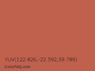YUV 122.826,-22.592,59.789 Color is a normal red color and the nearest color is Cedar Chest #c95a49. Hex code #bf614d and RGB value is rgb(191,97,77). In RGB color space, this color is composed of 75% red, 38% green, 30% blue, In CMYK color space, this color is composed of 0% cyan, 49% magenta, 60% yellow , 25% black , In HSL color space, this color has a hue angle of 11° , 47% saturation and 53% lightness.