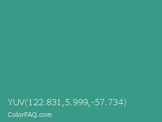 YUV 122.831,5.999,-57.734 Color is a normal cyan color and the nearest color is Zomp #39a78e. Hex code #399a87 and RGB value is rgb(57,154,135). In RGB color space, this color is composed of 22% red, 60% green, 53% blue, In CMYK color space, this color is composed of 63% cyan, 0% magenta, 12% yellow , 40% black , In HSL color space, this color has a hue angle of 168° , 46% saturation and 41% lightness.