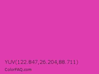 YUV 122.847,26.204,88.711 Color is a normal magenta color and the nearest color is Frostbite #e936a7. Hex code #e03db0 and RGB value is rgb(224,61,176). In RGB color space, this color is composed of 88% red, 24% green, 69% blue, In CMYK color space, this color is composed of 0% cyan, 73% magenta, 21% yellow , 12% black , In HSL color space, this color has a hue angle of 318° , 72% saturation and 56% lightness.