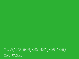 YUV 122.869,-35.431,-69.168 Color is a normal green color and the nearest color is Wageningen Green #34b233. Hex code #2cb133 and RGB value is rgb(44,177,51). In RGB color space, this color is composed of 17% red, 69% green, 20% blue, In CMYK color space, this color is composed of 75% cyan, 0% magenta, 71% yellow , 31% black , In HSL color space, this color has a hue angle of 123° , 60% saturation and 43% lightness.