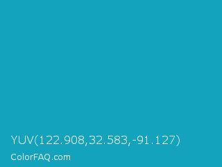 YUV 122.908,32.583,-91.127 Color is a normal cyan color and the nearest color is Blue Green #0d98ba. Hex code #13a3bd and RGB value is rgb(19,163,189). In RGB color space, this color is composed of 7% red, 64% green, 74% blue, In CMYK color space, this color is composed of 90% cyan, 14% magenta, 0% yellow , 26% black , In HSL color space, this color has a hue angle of 189° , 82% saturation and 41% lightness.