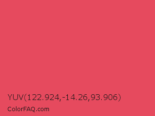 YUV 122.924,-14.26,93.906 Color is a normal red color and the nearest color is Paradise Pink #e63e62. Hex code #e64a5e and RGB value is rgb(230,74,94). In RGB color space, this color is composed of 90% red, 29% green, 37% blue, In CMYK color space, this color is composed of 0% cyan, 68% magenta, 59% yellow , 10% black , In HSL color space, this color has a hue angle of 352° , 76% saturation and 60% lightness.