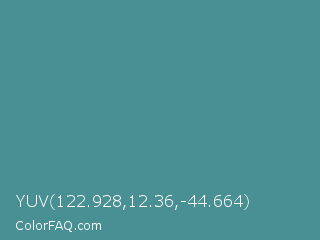 YUV 122.928,12.36,-44.664 Color is a normal cyan color and the nearest color is Smalt Blue #51808f. Hex code #489094 and RGB value is rgb(72,144,148). In RGB color space, this color is composed of 28% red, 56% green, 58% blue, In CMYK color space, this color is composed of 51% cyan, 3% magenta, 0% yellow , 42% black , In HSL color space, this color has a hue angle of 183° , 35% saturation and 43% lightness.