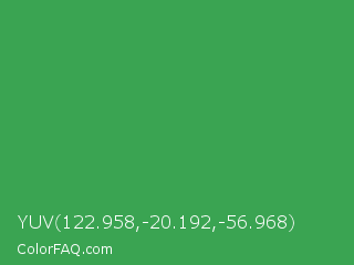 YUV 122.958,-20.192,-56.968 Color is a normal green color and the nearest color is Chateau Green #40a860. Hex code #3aa452 and RGB value is rgb(58,164,82). In RGB color space, this color is composed of 23% red, 64% green, 32% blue, In CMYK color space, this color is composed of 65% cyan, 0% magenta, 50% yellow , 36% black , In HSL color space, this color has a hue angle of 134° , 48% saturation and 44% lightness.