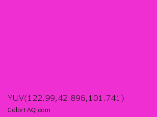 YUV 122.99,42.896,101.741 Color is a normal magenta color and the nearest color is Razzle Dazzle Rose #ff33cc. Hex code #ef2fd2 and RGB value is rgb(239,47,210). In RGB color space, this color is composed of 94% red, 18% green, 82% blue, In CMYK color space, this color is composed of 0% cyan, 80% magenta, 12% yellow , 6% black , In HSL color space, this color has a hue angle of 309° , 86% saturation and 56% lightness.
