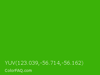 YUV 123.039,-56.714,-56.162 Color is a normal green color and the nearest color is Kelly Green #4cbb17. Hex code #3bb208 and RGB value is rgb(59,178,8). In RGB color space, this color is composed of 23% red, 70% green, 3% blue, In CMYK color space, this color is composed of 67% cyan, 0% magenta, 96% yellow , 30% black , In HSL color space, this color has a hue angle of 102° , 91% saturation and 36% lightness.