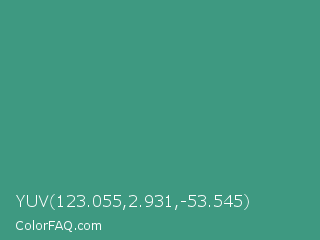 YUV 123.055,2.931,-53.545 Color is a normal cyan color and the nearest color is Illuminating Emerald #319177. Hex code #3e9981 and RGB value is rgb(62,153,129). In RGB color space, this color is composed of 24% red, 60% green, 51% blue, In CMYK color space, this color is composed of 59% cyan, 0% magenta, 16% yellow , 40% black , In HSL color space, this color has a hue angle of 164° , 42% saturation and 42% lightness.