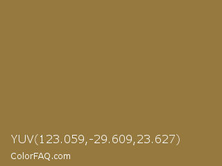 YUV 123.059,-29.609,23.627 Color is a normal orange color and the nearest color is Metallic Sunburst #9c7c38. Hex code #96793f and RGB value is rgb(150,121,63). In RGB color space, this color is composed of 59% red, 47% green, 25% blue, In CMYK color space, this color is composed of 0% cyan, 19% magenta, 58% yellow , 41% black , In HSL color space, this color has a hue angle of 40° , 41% saturation and 42% lightness.